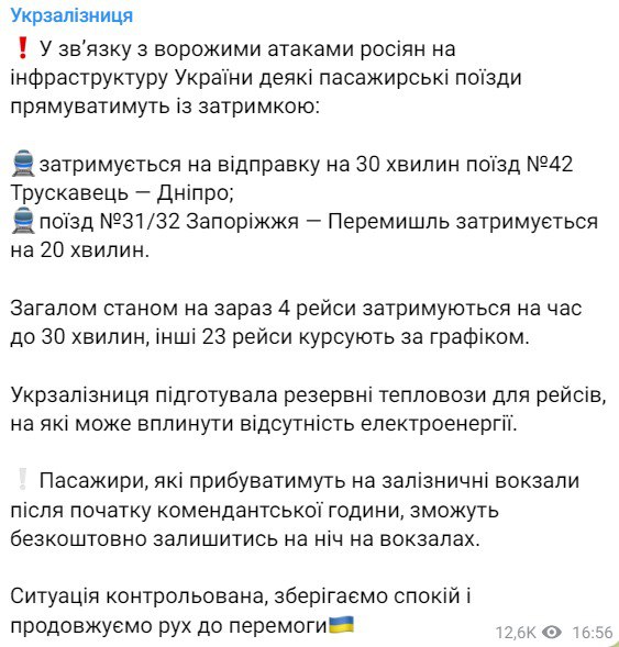 Компания "Укрзализныця" сообщает, что в связи с ударами по инфраструктуре 15 ноября опаздывают поезда: