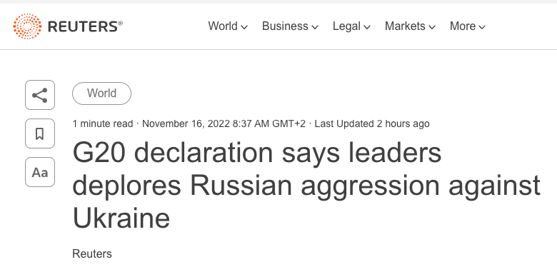 Участники саммита G20 на Бали согласовали совместную декларацию, в которой большинство стран "самым решительным образом осудили" российскую агрессию против Украины, но были и "другие взгляды и разные оценки ситуации и санкций".