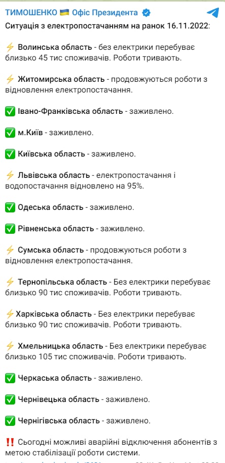 Офис президента публикует сводку о состоянии энергетики по регионам после вчерашних ракетных ударов РФ.