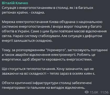 Он объяснил, что киевская энергосеть включена в национальную систему, а она была сильно нарушена вчерашними массовыми российскими обстрелами.