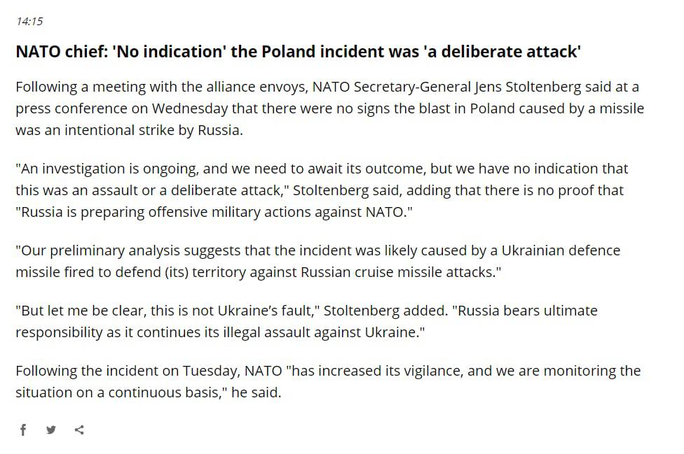 По словам Столтенберга, нет признаков того, что взрыв в Польше, вызванный ракетой, был преднамеренным ударом России.