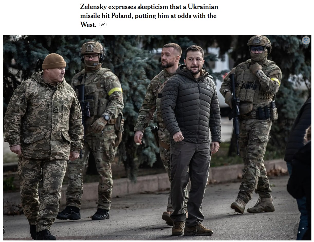 07:55 Сомнения Зеленского в том, что украинская ракета поразила территорию Польши, продолжают обсуждаться в западной прессе.