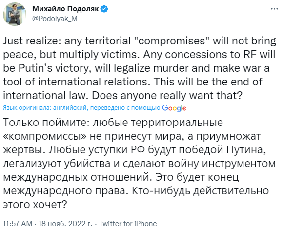 "Просто осознайте: любые территориальные "компромиссы" не принесут мира, а приумножат жертвы. Любые уступки РФ будут победой Путина (Владимир Путин, президент России, - Ред.), легализуют убийства и сделают войну инструментом международных отношений. Это будет конец международного права. Разве кто-то этого хочет?", - пишет Подоляк.