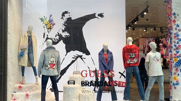 Guess использовал знаменитое граффити Бэнкси "Метатель цветов" в своей витрине. Фото: instagram.com/banksy