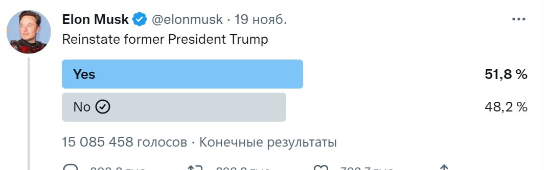 В опросе приняли участие более 15 миллионов аккаунтов, голоса разделились почти пополам. За восстановление учетной записи Трампа проголосовало 51,8%, против - 48,2%.