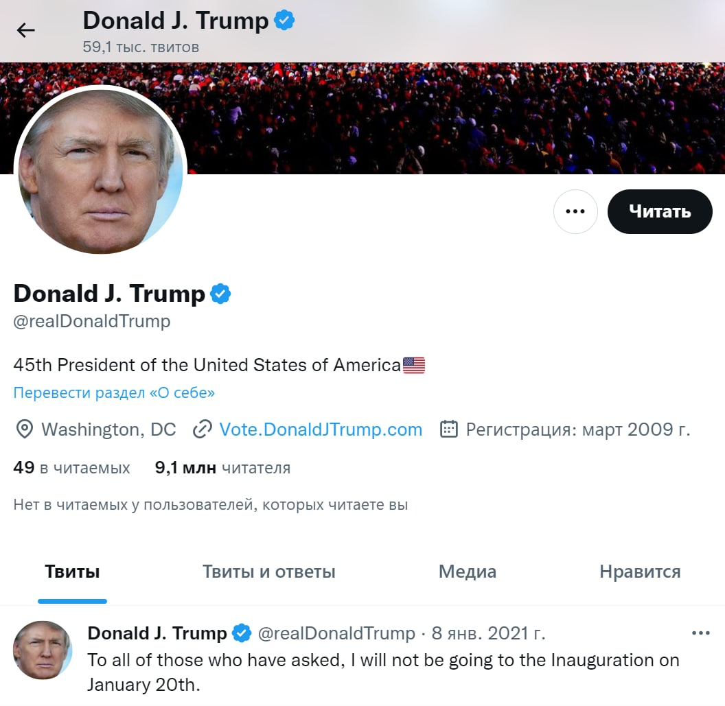 Пока Трамп ничего в Твиттере не написал: последняя запись датирована 8-м января 2021 года.