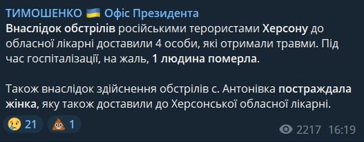 Из-за обстрелов Херсона в больницы доставили четверых человек. Один из пострадавших во время госпитализации умер.