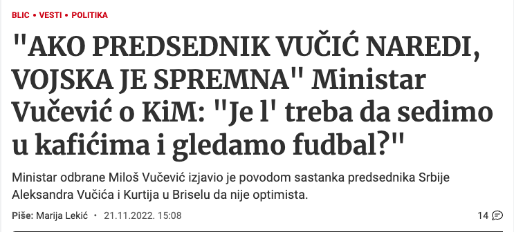 Продолжается рост напряжённости между Сербией и Косово. Министр обороны Сербии Милош Вучевич заявил о готовности применить армию.