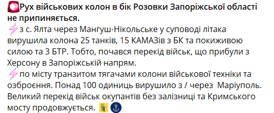 По словам Андрющенко, из с. Ялта через Мангуш-Никольское в сопровождении самолета отправилась колонна в составе 25 танков, 15 КАМАЗов с БК и живой силой, а также трех БТР.