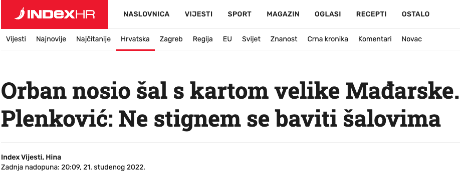 Премьер-министра Венгрии Виктора Орбана заметили с шарфом, на котором изображена карта "Великой Венгрии" с частями соседних государств в ее составе. С таким элементом одежды он пришел на товарищеский футбольный матч между сборными Венгрии и Греции в Будапеште.
