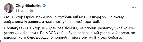 "Пропаганда в Венгрии идей ревизионизма не способствует развитию украино-венгерских отношений. В МИД Украины будет приглашен венгерский посол, который будет поставлен в известность о неприемлемости поступка Виктора Орбана", - сообщил спикер украинского МИДа Олег Николенко.