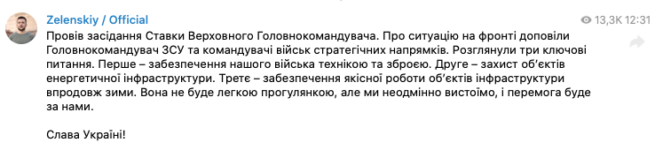 "О ситуации на фронте доложили Главнокомандующий ВСУ и командующие войсками стратегических направлений. Рассмотрели три ключевых вопроса. Первое – обеспечение нашей армии техникой и оружием. Второе – защита объектов энергетической инфраструктуры. Третье – обеспечение качественной работы объектов инфраструктуры зимой. Она не будет легкой прогулкой, но мы обязательно выстоим, и победа будет за нами", - заявил Зеленский.