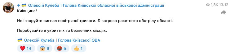 Власти Киевской области также предупреждают об угрозе ракетного удара.