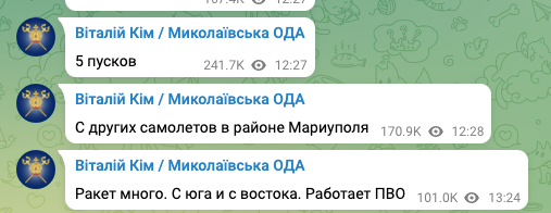 Губернатор Николаевской области Виталий Ким пишет о большом количестве российских ракет, запущенных с юга и востока. В частности, из района Мариуполя.