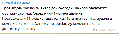 В результате сегодняшнего удара по Киеву погибли три человека, еще 11 ранены - Кличко