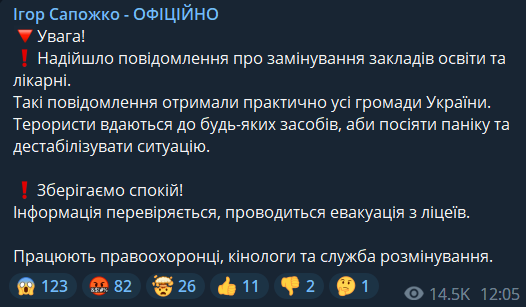 "Поступило сообщение о заминировании учебных заведений и больниц. Такие сообщения получили практически все громады Украины. Террористы прибегают к любым средствам, чтобы посеять панику и дестабилизировать ситуацию. Информация проверяется, производится эвакуация из лицеев", - говорится в сообщении.