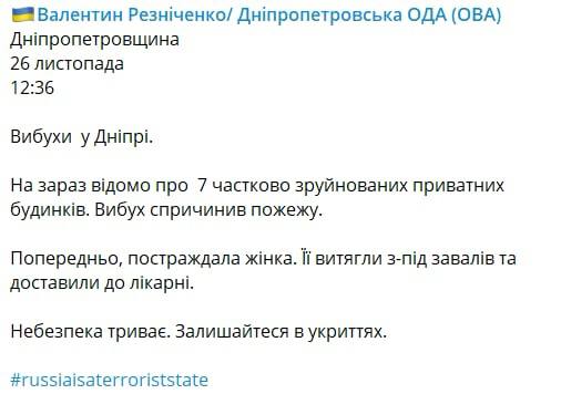 12.44 Глава Днепровской ОВА Резниченко говорит о 7 разрушенных частных жилых домах после сегодняшних ракетных ударов.