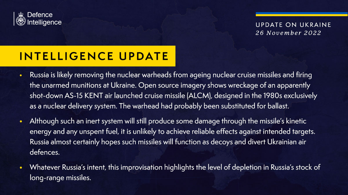 Британская разведка пишет, что такая инертная система по-прежнему будет наносить некоторый ущерб за счет кинетической энергии ракеты и любого неизрасходованного топлива, но она вряд ли обеспечит надежное воздействие на намеченные цели. Россия почти наверняка надеется, что такие ракеты будут служить ложными целями и отвлекать украинскую систему ПВО.