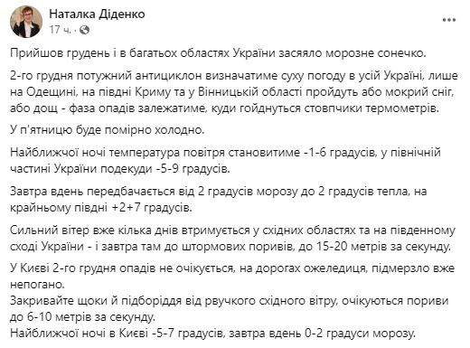 Об этом сообщает синоптик Наталья Диденко на своей странице в Facebook.