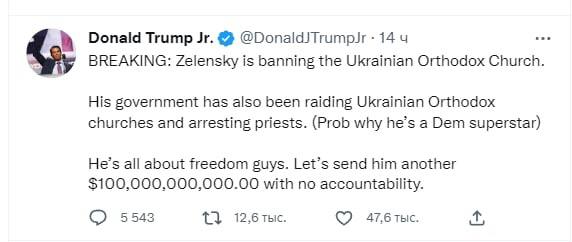 "Зеленский запрещает Украинскую православную церковь. Его правительство также отбирает храмы Украинской православной церкви и арестовывает священников (возможно, поэтому для демократов он - суперзвезда). Он - это всецело о свободе, ребята. Давайте отправим ему ещё 100 миллиардов долларов безо всякой отчетности", - пишет Трамп-младший в Твиттере.
