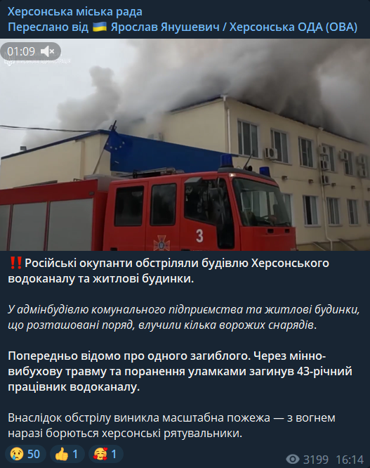 "В админздание коммунального предприятия и рядом расположенные жилые дома попали несколько вражеских снарядов. Предварительно известно об одном погибшем. Из-за минно-взрывной травмы и ранения обломками погиб 43-летний работник водоканала. В результате обстрела возник масштабный пожар — с огнем борются херсонские спасатели", - говорится в сообщении горсовета.