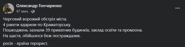 Последствия сегодняшнего вражеского обстрела Краматорска. Фото: Facebook
