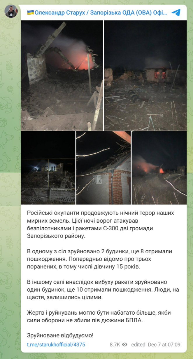 В ночь с 6 на 7 декабря россияне атаковали Запорожскую область беспилотниками и ракетами С-300. В результате ранены три человека, в том числе 15-летняя девочка-подросток.