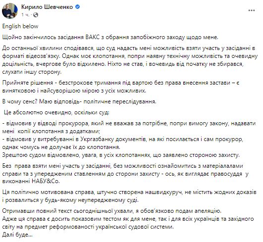 "До последней минуты надеялся, что суд предоставит мне возможность поучаствовать в заседании в формате видеосвязи. Однако мое ходатайство, несмотря на техническую возможность и очевидную целесообразность, в очередной раз было отклонено. Принятое решение – бессрочное содержание под стражей без права внесения залога – является исключительной и строжайшей мерой из всех возможных", - написал Шевченко на своей странице в Facebook.