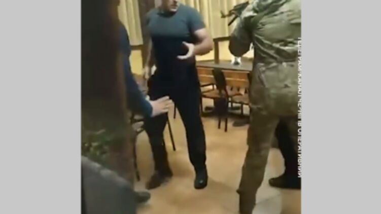 В социальных сетях распространяется видео из черниговского кафе "Таверна", где одетый в военную форму автоматчик стреляет в разбушевавшегося посетителя.