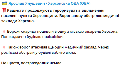 "Вражеские снаряды попали в одну из городских больниц Херсона. Повреждено здание поликлиники. Также враг атаковал еще одно медицинское учреждение. Из-за российских обстрелов в здании выбиты окна", - говорится в сообщении.