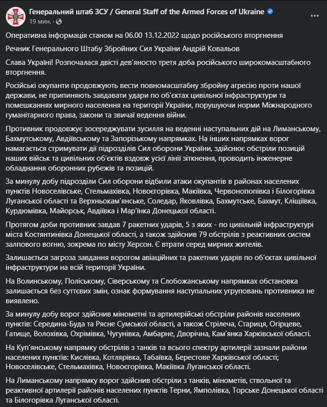 Война в Украине продолжается уже 293-й день. "Страна" следит за новостями 13 декабря в своем онлайне .