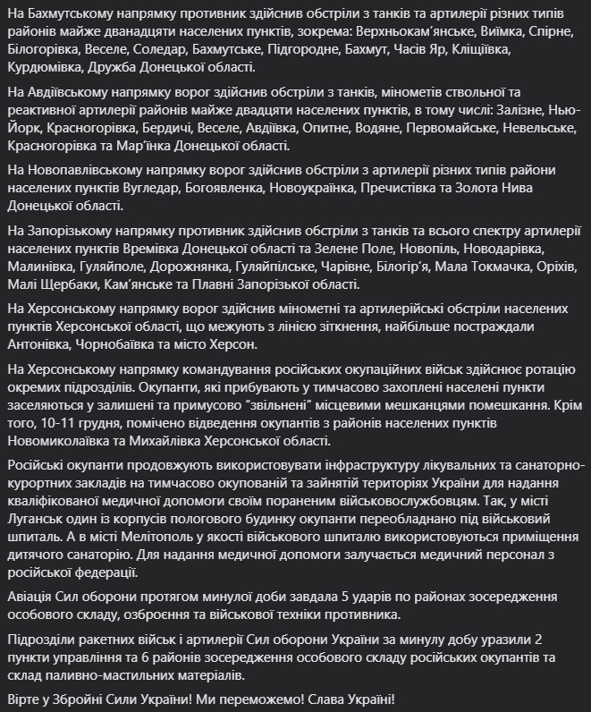 7. 10-11 декабря, отмечен отвод оккупантов из районов населенных пунктов Новониколаевка и Михайловка Херсонской области.