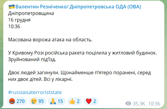 Об этом 16 декабря в телеграм-канале сообщил губернатор Днепропетровской области Валентин Резниченко.