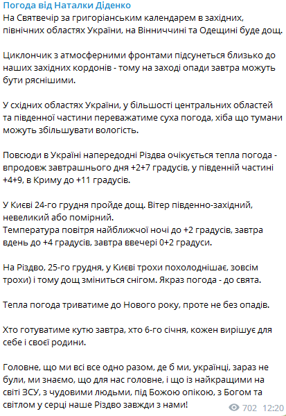 На католический Сочельник, 24 декабря, в западных, северных областях Украины, а также Винницкой и Одесской областях прогнозируют дождь. Об этом сообщает синоптик Наталья Диденко в своем телеграм-канале.