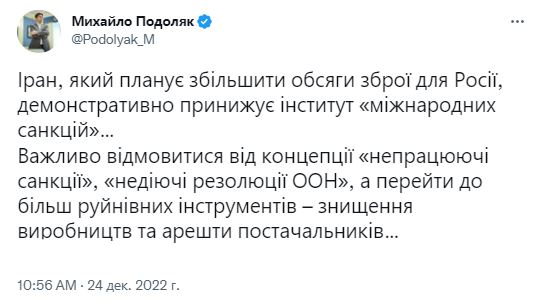 "Иран, планирующий увеличить объемы оружия для России, демонстративно унижает институт "международных санкций", - считает Подоляк.