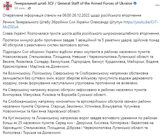 Генштаб Вооруженных Сил Украины обнародовал сводку о ситуации на фронте на утро 26 декабря.