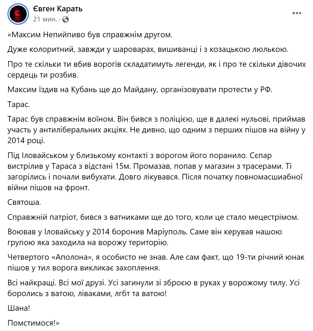 При этом другие представители праворадикального движения пишут посты, из которых следует, что эти участники "Братства" действительно погибли. Например, об этом написал Евгений Карась.