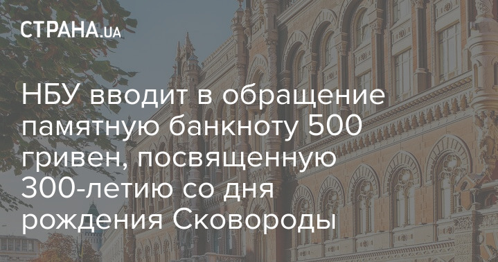 Национальный банк Украины 29 декабря 2022 года вводит в обращение новую памятную банкноту номиналом 500 гривен, посвященную 300-летию со дня рождения выдающегося украинского философа, богослова, поэта, музыканта, педагога - Григория Сковороды.