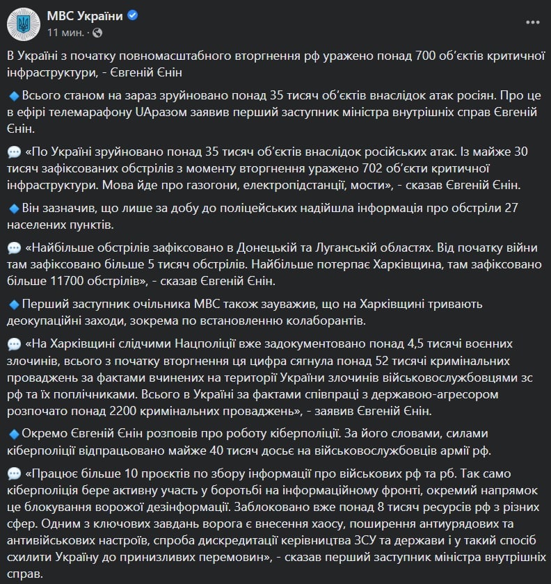10.30 В Украине после полномасштабного вторжения РФ поражено более 700 объектов критической инфраструктуры, заявил замглавы МВД Евгений Енин в эфире телемарафона.