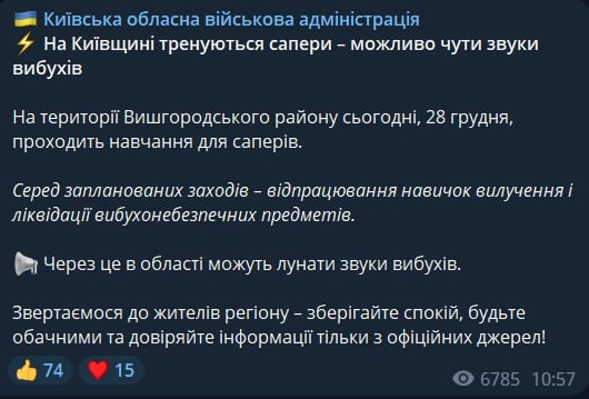 Вместе с тем КОВА сегодня сообщила о работе саперов в Вышгородском районе.
