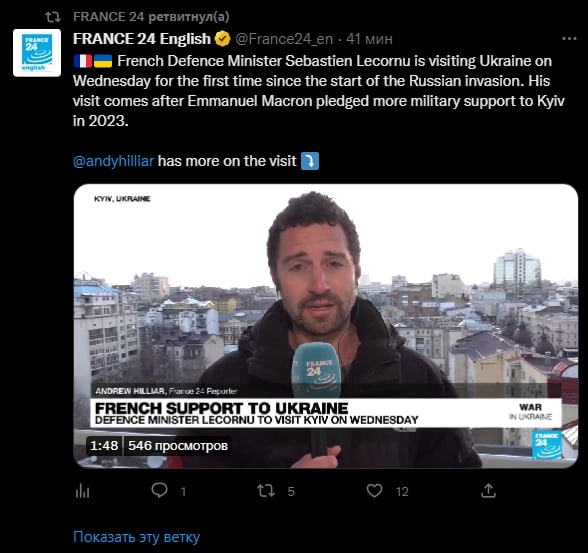 12.30 Министр обороны Франции Себастьян Лекорню прибыл в Киев, сообщает France 24.