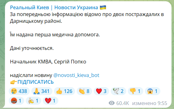 Также повреждены два частных дома в Дарницком районе. По предварительной информации, пострадали два человека, им оказана помощь.