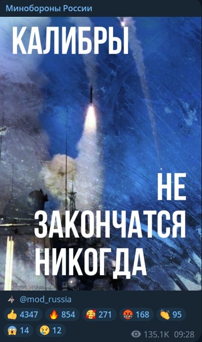 Чего сама Россия не подтверждает и даже периодически пытается опровергать. Сегодня российское минобороны во время ракетной атаки опубликовало у себя в телеграме картинку с надписью "Калибры не закончатся никогда".