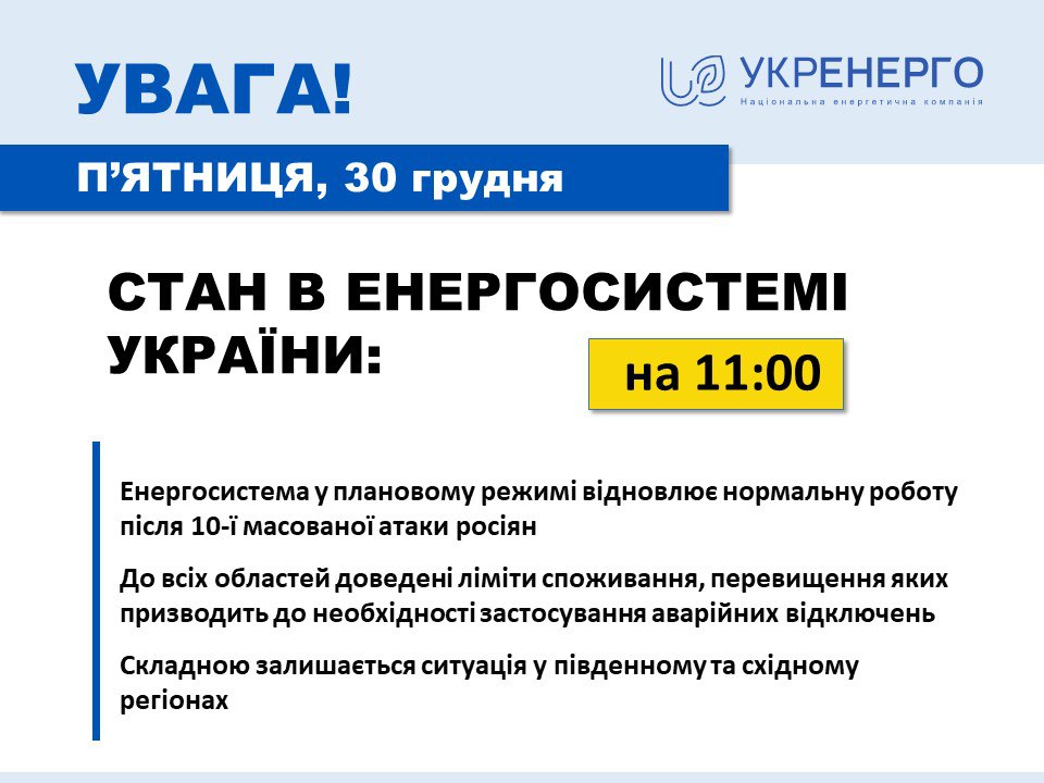 По состоянию на 30 декабря в энергосистеме Украины дефицит мощности находится на том же уровне, что и до 10-й массированной ракетной атаки россиян. Благодаря профессиональным действиям диспетчерского центра "Укрэнерго" последствия повреждений оказали значительно меньшее влияние на работу энергосистемы, чем ожидал враг.