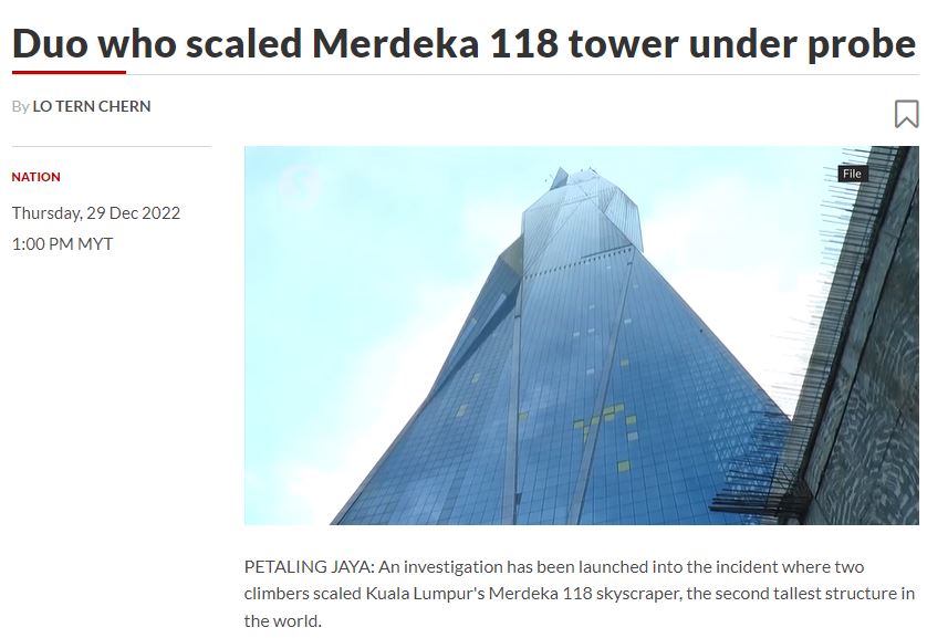 Двое блогеров из России поднялись на крышу второго по высоте сооружения в мире - малайзийского небоскреба Merdeka 118 (высота 678 метров - Ред.). Сейчас правительство расследует инцидент, а владельцы здания угрожают иском.