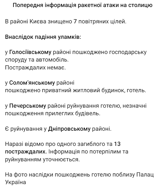 - в Печерском районе разрушение гостиницы, незначительные повреждения близлежащих построек, в том числе - Дворца "Украина".