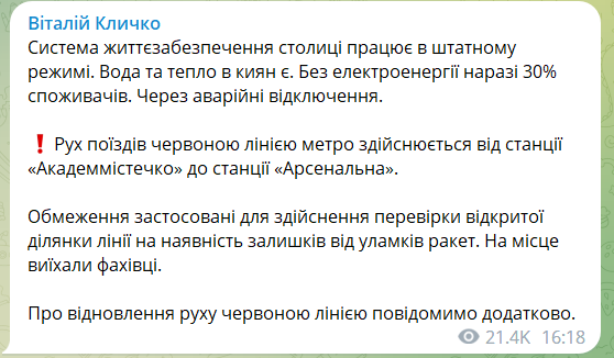 Об этом в телеграм-канале сообщил мэр Киева Виталий Кличко.