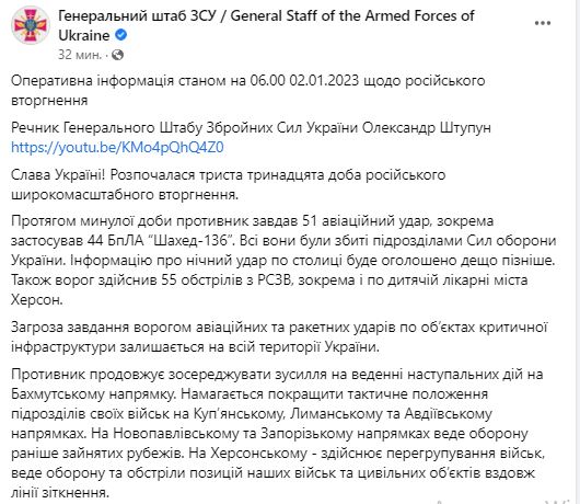 1. За прошедшие сутки противник нанес 51 авиаудар, в том числе применил 44 дрона-шахида. Все они были сбиты подразделениями сил обороны Украины (информация о ночном ударе по Киеву пообещали обнародовать позже). Также враг совершил 55 обстрелов из РСЗО, в том числе и по детской больнице Херсона.