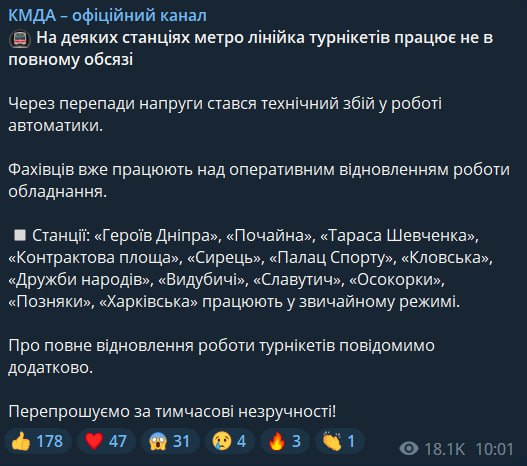 В КГГА сообщили, что проблемы с работой турникетов в метро Киева связаны со сбоем в работе автоматики из-за перепадов напряжения.