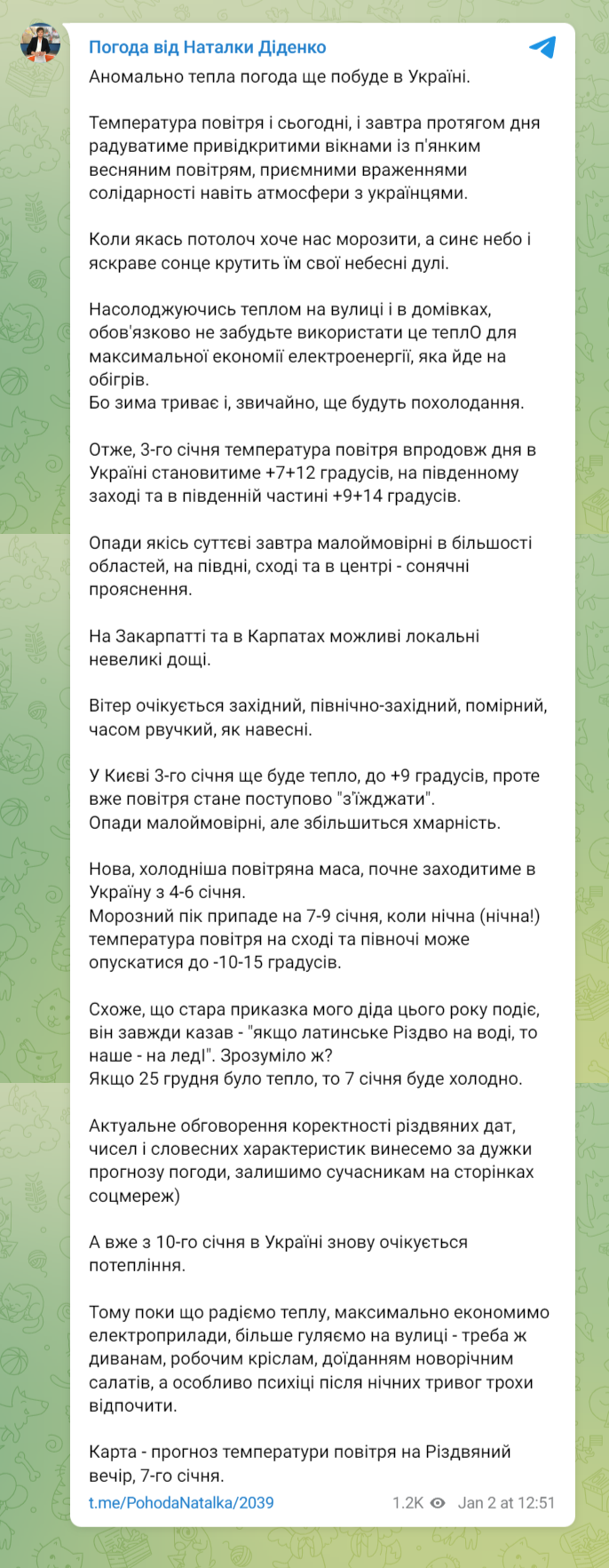 Об этом написала синоптик Наталья Диденко на своей странице в Telegram.